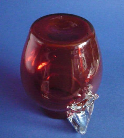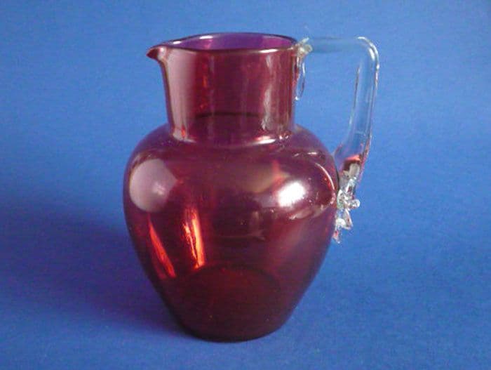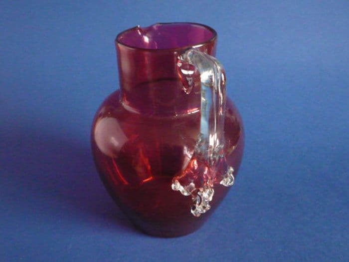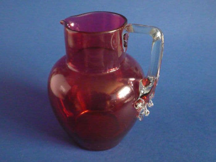 A lovely handmade Victorian cranberry jug with an unusual applied clear glass handle. Great depth of colour and in excellent condition. Polished pontil mark to base. Stourbridge circa 1880. Height 17.5cm (6.9in)