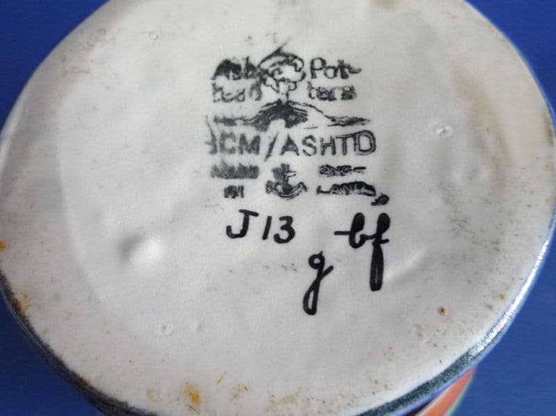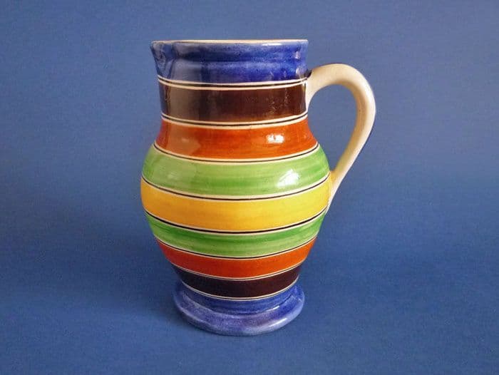 A classic Ashtead Pottery Brittany jug designed by Phoebe and Harold Stabler with brightly coloured banding ('harlequin hoops') in blue, black, brown, green and yellow. In great condition; no chips, cracks or restoration. Some age crazing inside the rim typical of these wares. Printed Ashtead Potters with painted pattern 'bf', shape J13 and painter's marks. Height 17.1cm (6.75in)