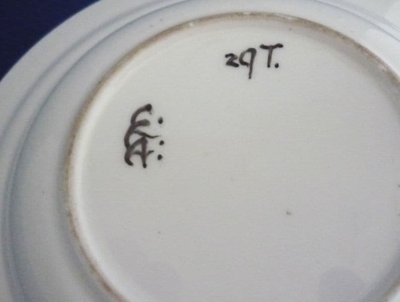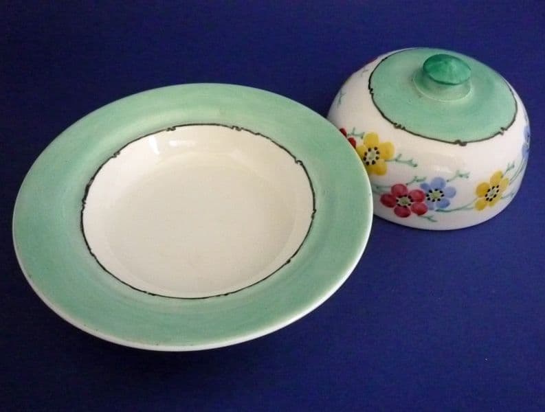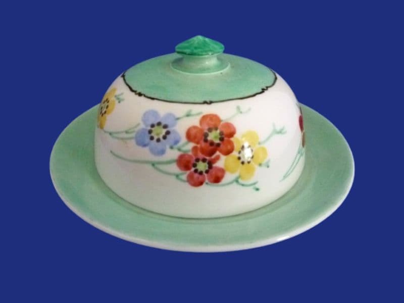 A pretty little Bough Pottery covered dish for butter or cream cheese. Decorated by Christina Catherine Amour with stylised prunus flowers and banded in green. In excellent condition - no chips, cracks or restoration. Rare to find, especially in such good order. Painted initials CCA with pattern reference. Base diameter 13cm (5.1in)