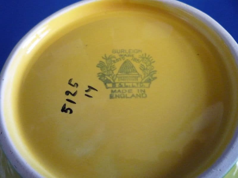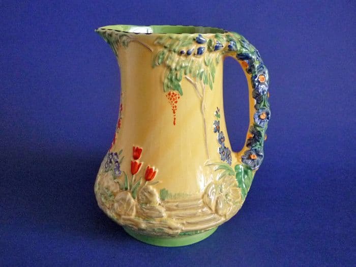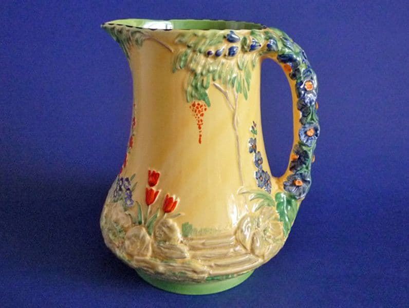 A stunning relief moulded jug by Burleigh Ware hand painted with a garden scene on a yellow ground - steps and a rockery with tulips, hollyhocks and delphiniums in blue and orange. The handle is formed from clusters of flowers in blue with yellow centres. A much sought after design and in excellent condition - no chips, cracks or restoration and showing little sign of wear. Rare to find in such good order. Printed Burleigh Ware beehive mark with painted pattern number 5125 and decorator's mark. Height 18.5cm (7.25in)