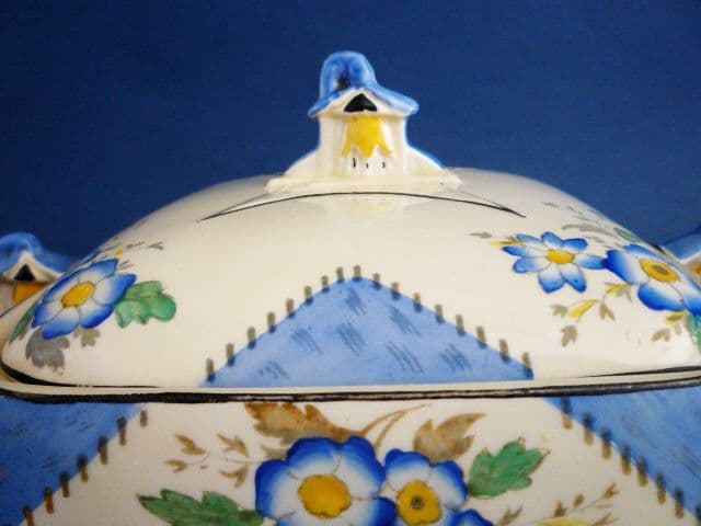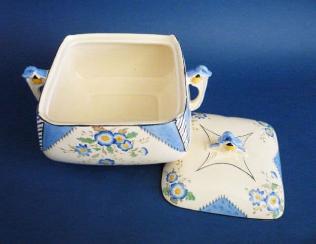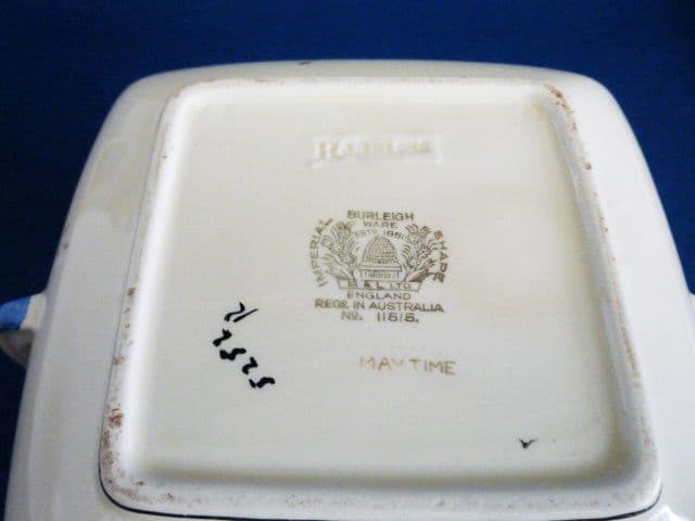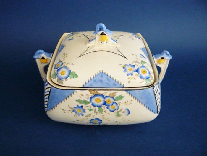 A beautiful shape designed by Ernest Bailey with crown imperials for the handles. A classic hand painted Burleigh Ware design, Maytime works well on this rare art deco shape. In good condition, showing little sign of wear. Burleigh Ware marks (also shape and pattern names with Australian registration) and impressed registration number. Width with handles 21cm (8.25in)
