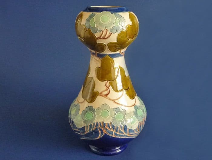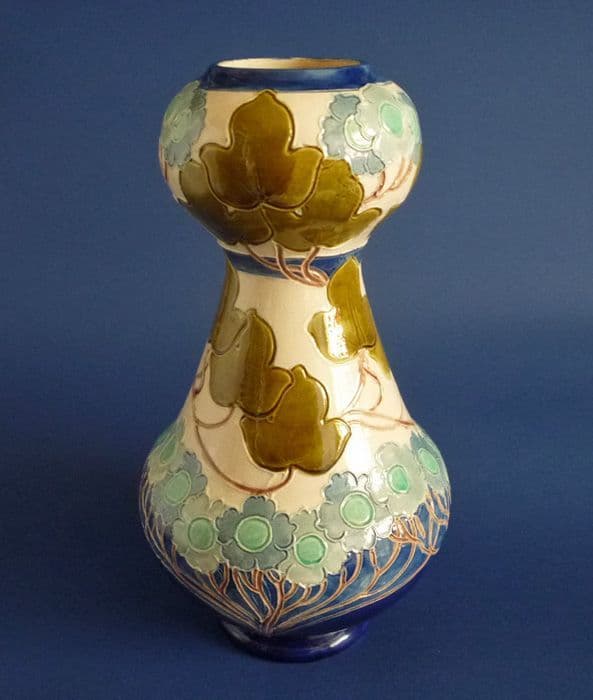A superb Burmantofts double gourd shape vase with incised and moulded decoration designed by Joseph Walmsley. Stylised art nouveau ivy leaves and flowers in lovely faience greens and blues on a cream and cobalt blue ground. In excellent condition - no chips, cracks or restoration and with little sign of wear. A large and impressive piece, rare to find in such good order. Impressed Burmantofts Faience England with shape number 2206. Height 29cm (11.5in)