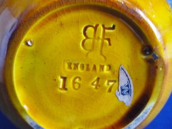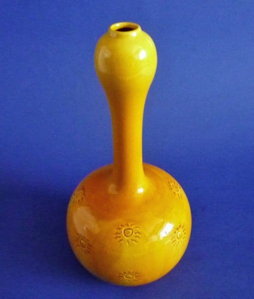 A superb Burmantofts Pottery arts and crafts gourd shaped vase with incised sunburst decoration on a deep yellow rippled glaze. A fine example and beautiful colour. In excellent condition; no chips, cracks or restoration. Impressed BF monogram England with shape number 1647 and traces of paper label. Height 23.25cm (9.1in)