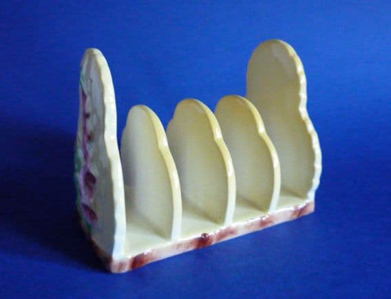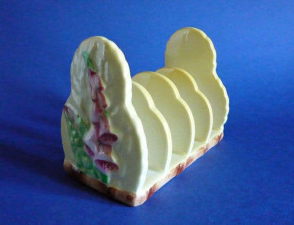 A classic Carlton Ware yellow foxglove toast rack with good colours, nicely painted and in great condition. Script Carlton Ware mark and impressed shape number 1875. Length 10.75cm (4.25in)