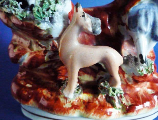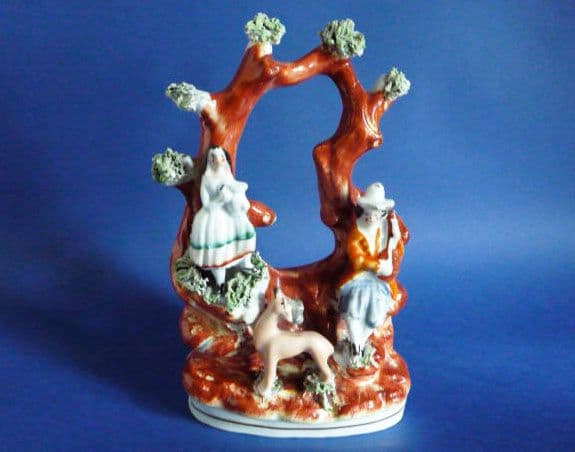 A charmingly rustic Staffordshire arbor group of a girl with water jug, boy playing a lute and a deer in the foreground. This lovely small group (the figures are only 2 inches +) is in great condition, with only some minor 'nibbles' to the boy's hat; barely noticeable given the scale. Height 17.75cm (7in)