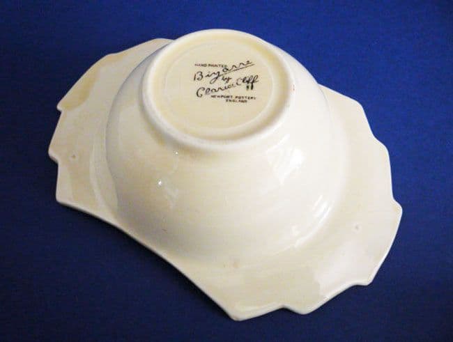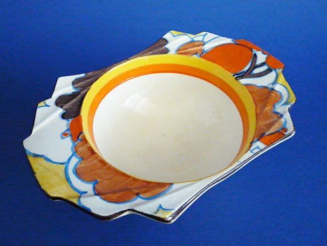 A Clarice Cliff Bizarre daffodil shape grapefruit bowl, beautifully painted in the original orange Autumn design introduced in 1932. In excellent condition, showing little sign of wear. Very fine painting on this lovely finned classic art deco shape. Lithographed 'Bizarre by Clarice Cliff' mark. Length 17.2cm (6.75in)