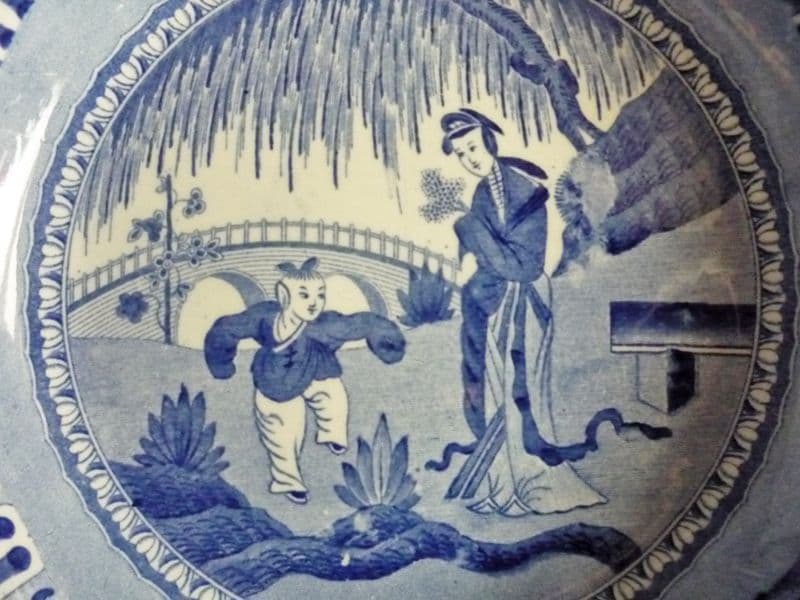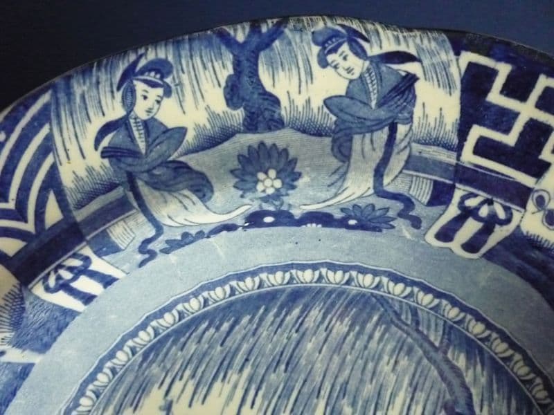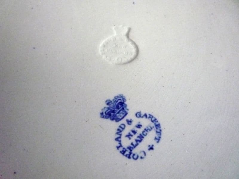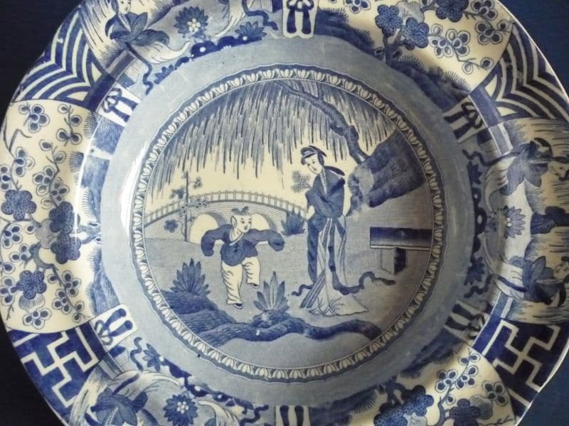 A lovely Copeland and Garrett 'Lange Lijsen' or 'Jumping Boy' soup plate. Printed in medium blue with Chinese figures under an overhanging tree with a two-arch bridge behind. In excellent condition - no chips, cracks or restoration. A finely potted indented shape using the 'New Blanche' earthenware body. Impressed and printed Copeland and Garrett New Blanche crown marks. Diameter 25cm (9.75in)