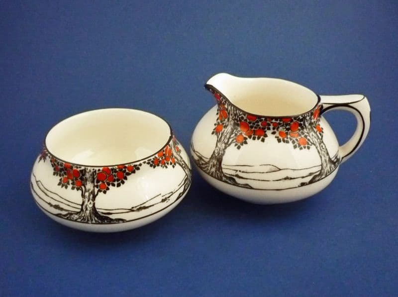 A lovely little Crown Ducal orange tree cream jug and sugar bowl. In excellent condition - no chips, cracks, fading or enamel loss. The design always looks stunning on this shape. Small coffee or tea for two size - quite difficult to find, especially in such good order. Printed factory marks with registration number. Height of jug 5.75cm (2.25in)