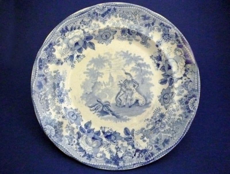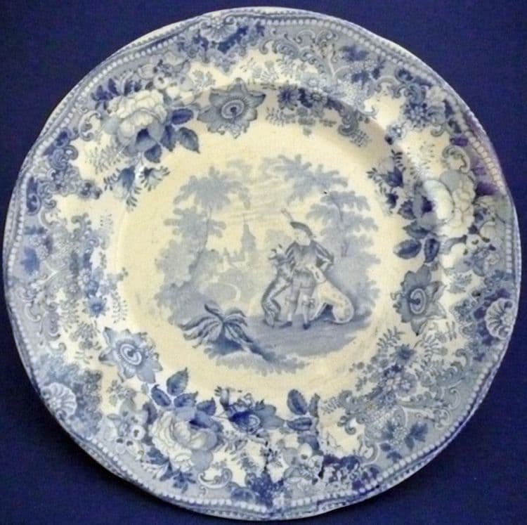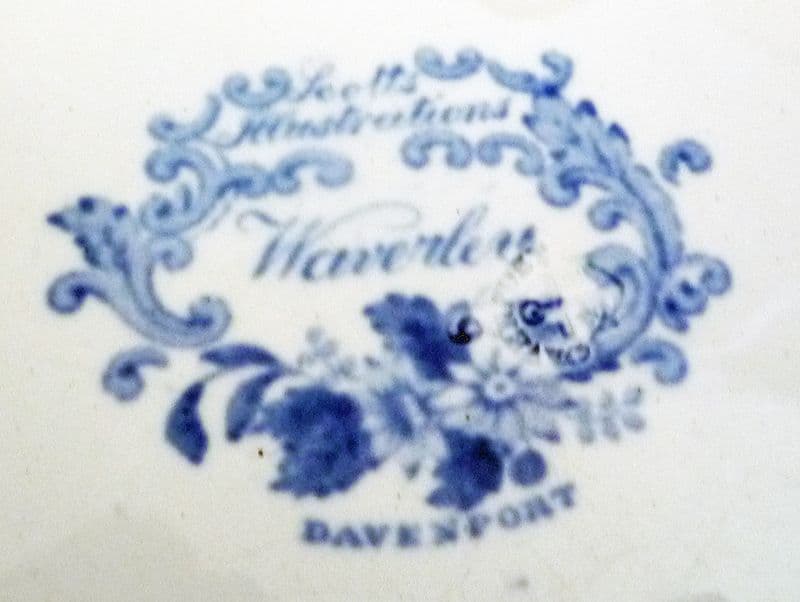 A fine plate from the Davenport series illustrating the works of Sir Walter Scott. Printed in medium blue with a scene from the Waverley novels depicting Edward Waverley and two hounds with Bradwardine castle in the background. Framed by a lovely floral border. In excellent condition - no chips, cracks or restoration. Printed Scott's Illustrations DAVENPORT mark and impressed DAVENPORT anchor with date for 1848. Diameter 20cm (7.9in)