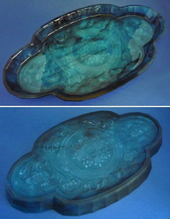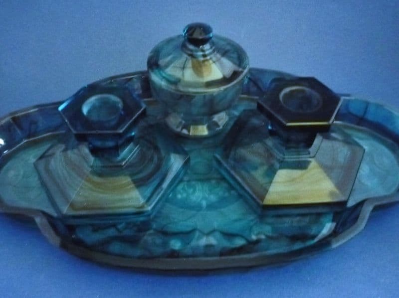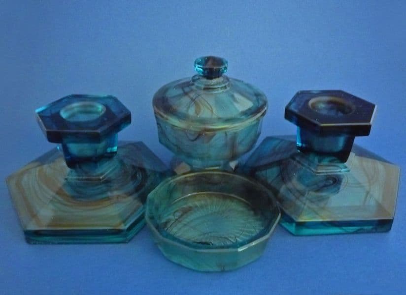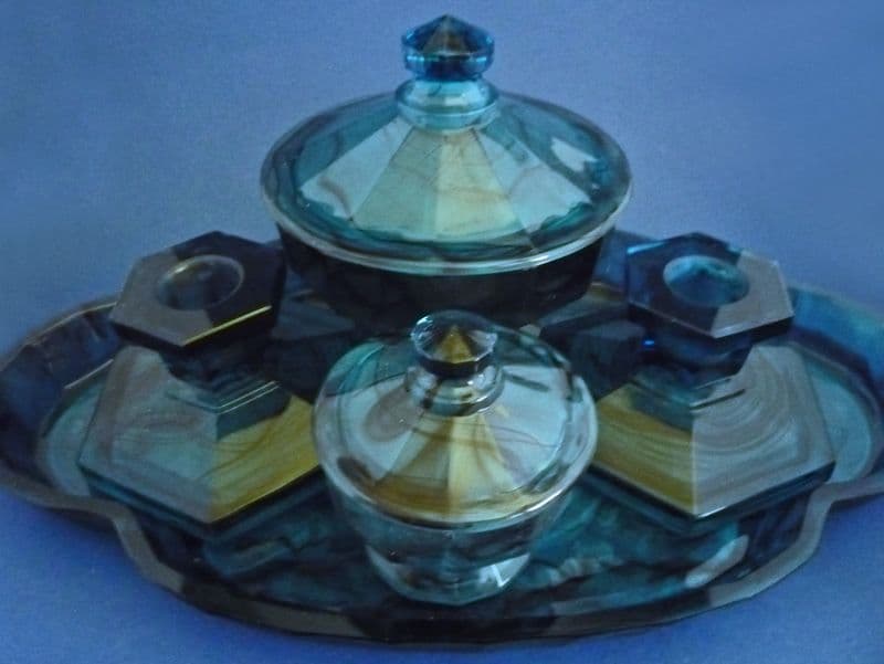 A superb blue cloud glass 8283 6-piece trinket set consisting of a tray, two candlesticks, large and small covered powder jars and trinket dish. The tray is outstanding with a lovely impressed 'intaglio' design. Stunning colours and in excellent condition - rare to find sets in such good order (the tray in particular is difficult to find unchipped). Displays beautifully. Width of tray 35cm (13.75in)
