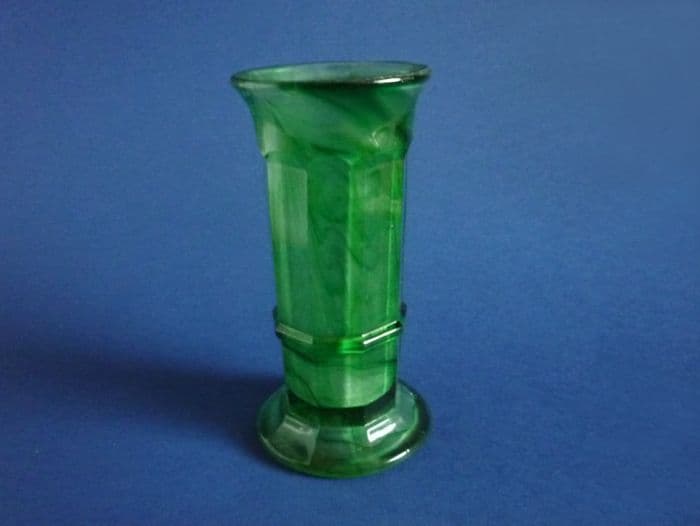 Davidson's pattern number 279, this is the smallest of three sizes and probably the most difficult to find. The nine panelled sides give it a column like shape. Great colours and in lovely condition. An excellent example of green cloud glass. Height 15.5cm (6.1in)