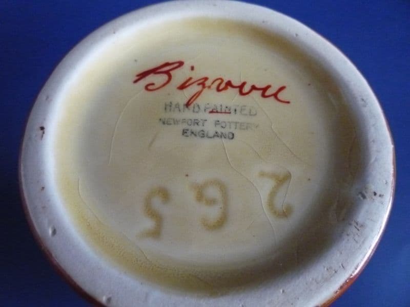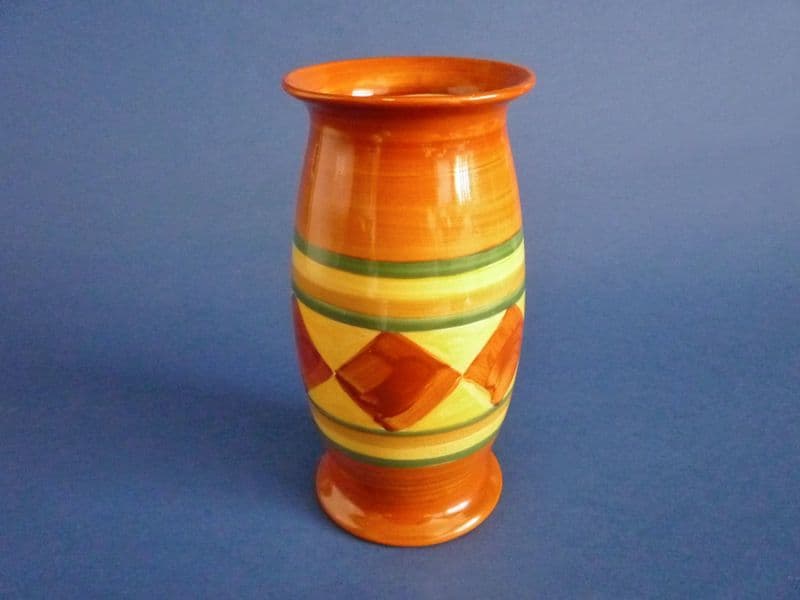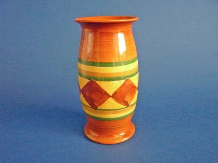 An early Bizarre 265 shape vase, nicely painted with a central panel of iron red diamonds bordered with green, yellow and orange bands. Every brush stroke is shown to emphasize the hand painted qualities of the range. In excellent condition - no chips, cracks or restoration and showing little sign of wear. Produced in the first few months of Clarice Cliff's original designs, it's a fine example of her early work . A lovely design on an old Newport shape. Newport Pottery mark (the old stock Clarice first used up) and hand written orange enamel 'Bizarre'' mark (the very first 'trial' Bizarre mark). Impressed shape number '265'. Height 15.5cm (6.1in)