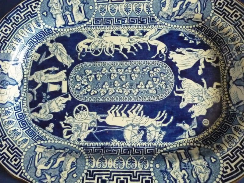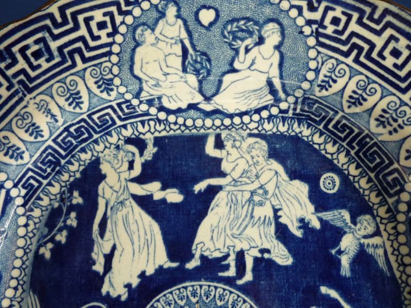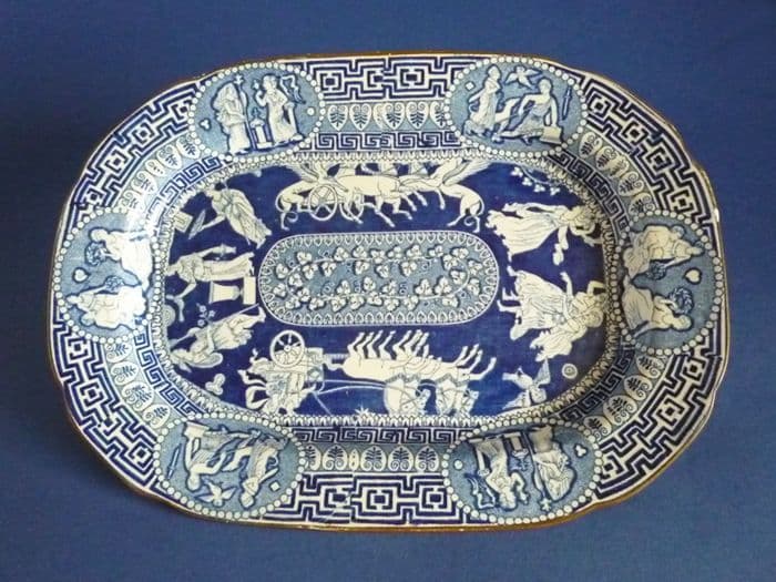 A beautiful little platter or serving dish printed in medium to dark blue with a classical pattern of chariots and figures around a central panel of vine leaves. The Greek key and anthemion border has six medallions with figures on a stippled ground. In excellent condition - no chips, cracks or restoration and only a little wear in places to the painted ochre rim. Rare to find, especially in such good order. Unmarked, though attributed to Herculaneum (a marked piece has yet to be found). Width 26.75cm (10.5in)