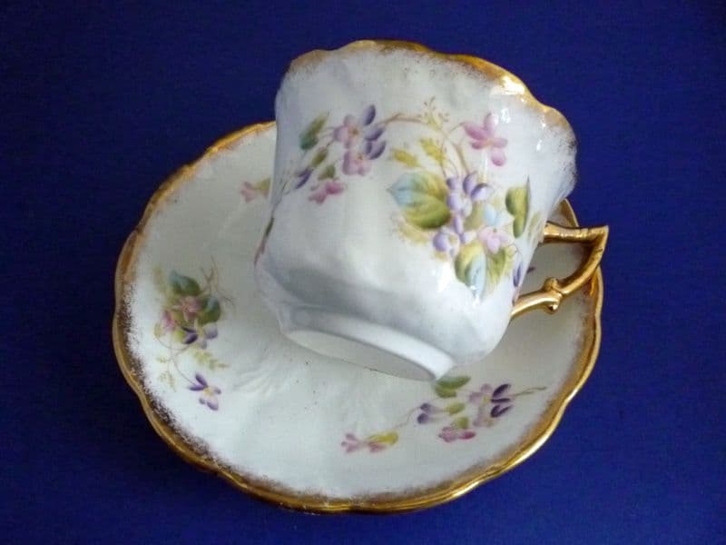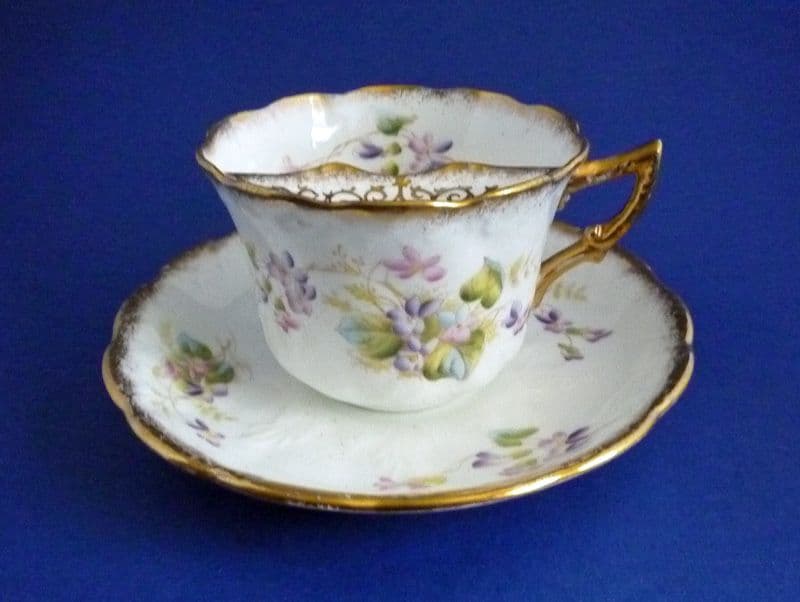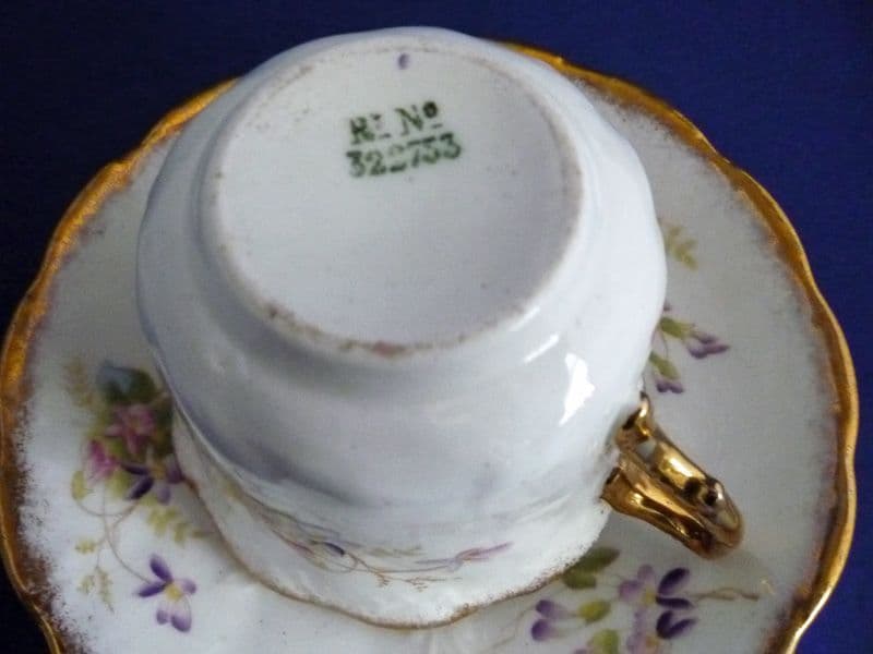 A lovely quality Victorian moustache cup and saucer by S. Fielding and Co. (Crown Devon). Decorated with sprays of hand enamelled violets and finely gilded. A classic early Crown Devon pattern sometimes seen on breakfast cups, but rare to find on a moustache cup. In excellent condition - no chips, cracks or restoration and showing little sign of wear. Cup printed with registration number 322753 for 1898. Diameter of saucer 15.75cm (6.25in)