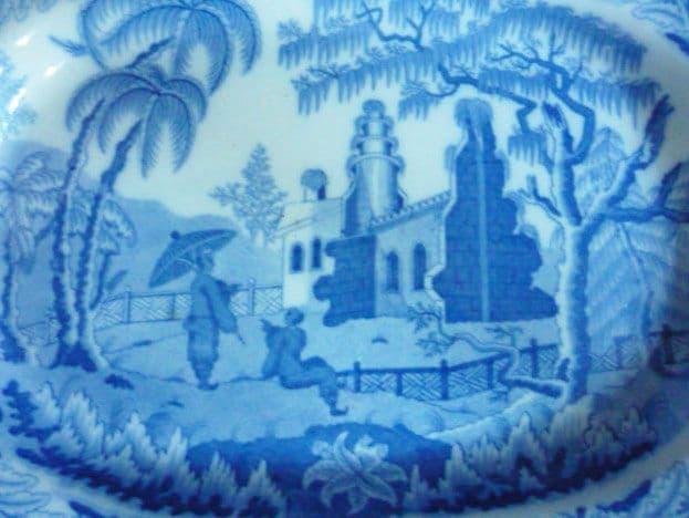 A lovely pearlware meat plate by Davenport in the striking 'Chinoiserie Ruins' pattern. Printed in medium blue and in great condition, showing a little sign of wear (some minor surface scratches but still displays beautifully). A nicely rounded and slightly dished shape with no foot rim, typical of early pearlware. Impressed anchor with 'Davenport'. Length 35.6cm (14in)