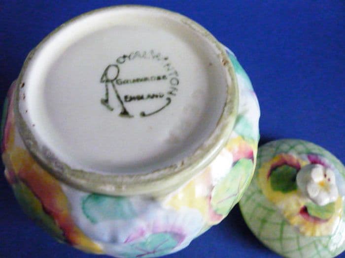 A lovely 'Gera' preserve pot by Royal Winton in the green colourway which isn't often seen. Pretty cream geranium flowers and multi-coloured leaves on a green basket weave background. Contrasts beautifully with the other gera colour ranges. In excellent condition; no chips, cracks or restoration. Circular green 'Royal Winton, Grimwades' mark and moulded 'GERA'. Height 10.25cm (4.1in)