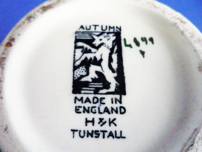 A lovely Hollinshead and Kirkham jug in the Grocott art deco design 'Autumn'. The 'luscious' colours of the boldly painted fruit work beautifully on this unusual shape. In excellent condition; no chips, cracks or restoration. Full H & K mark with Autumn. Height 12.5cm (4.9in)