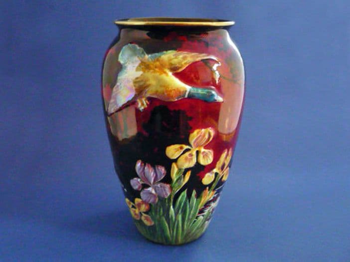 A beautiful Royal Winton Tiber shape vase from the rare embossed 'Game' series featuring a mallard flying over a lakeland setting with water irises in the foreground. Usually seen in dark blue or cream, this even rarer 'flambe' glaze has the duck and flowers delicately painted in coloured lustred enamels. A real gem in excellent condition. No chips, cracks, restoration or wear. Circular Royal Winton, Grimwades mark with impressed shape name. Height 19cm (7.5in)