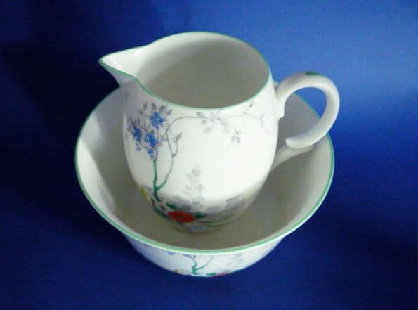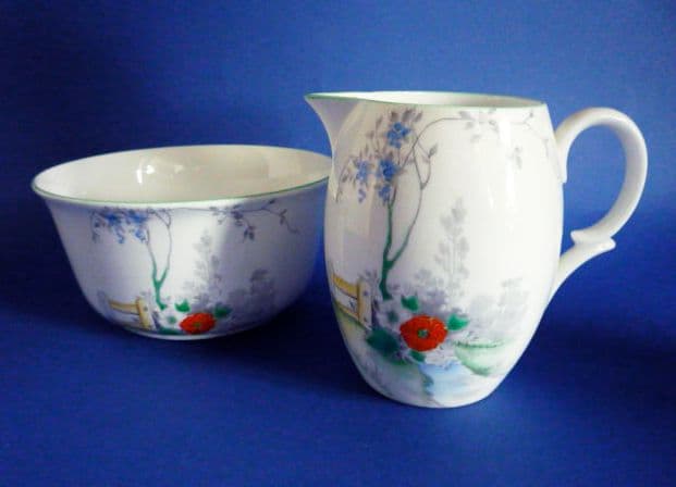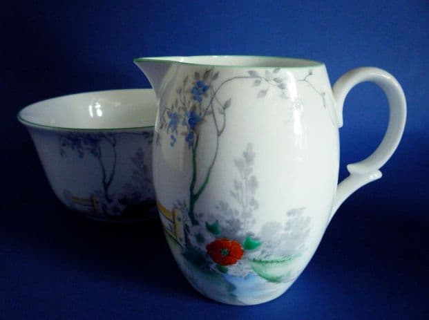 A lovely Shelley fence and stream design on an Empire bone china jug and basin. The delicate woodland scene is hand enamelled in blue, orange and green, with green trims and handle. Both pieces in excellent condition. Green Shelley mark. Height of jug 10.2cm (4in)