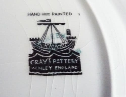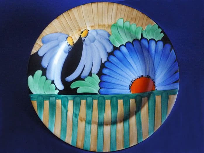 A striking wall plate produced by Gray's and boldly painted with art deco flowers in blue, orange and yellow. Given the name 'Hampton' and sold by Harrod's in the early 1930s. In great condition; no chips, cracks or restoration. Some mild crazing, noticed on the reverse, but nothing to detract. Rare to find, especially in such good order. Gray's Pottery, Hanley 'Pharaoh's Boat' mark. Diameter 27cm (10.6in)