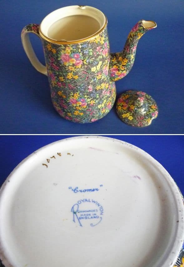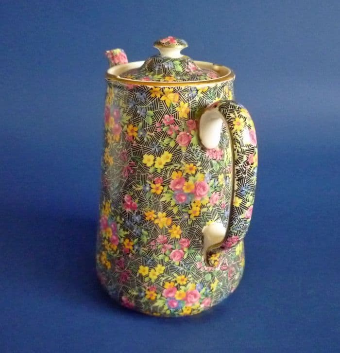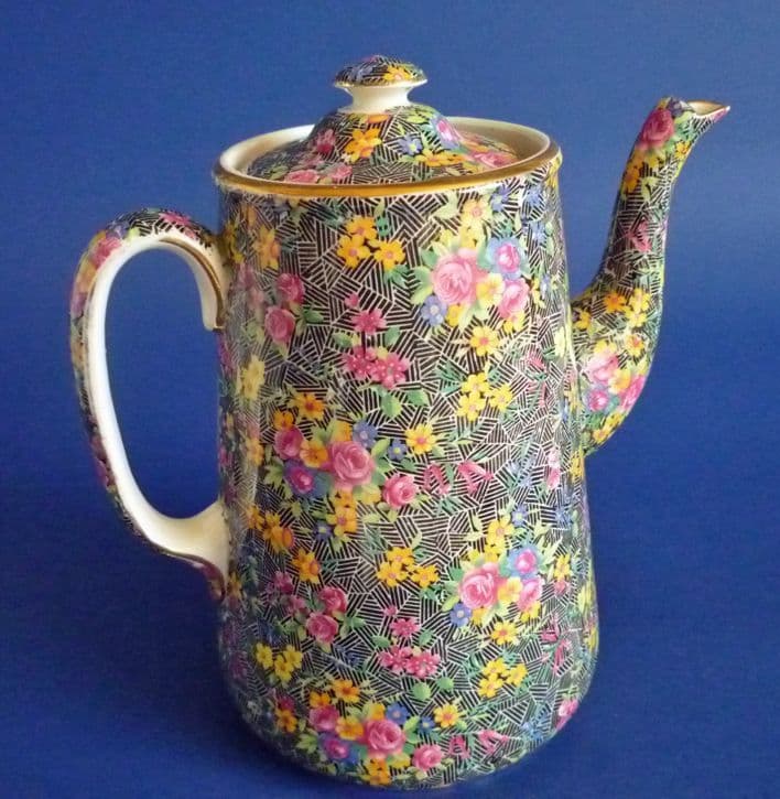 A large Countess shape coffee pot in the striking 'Cromer' chintz pattern. The bright colours and black background work beautifully on this rare Royal Winton shape. A great item in fine condition - no chips, cracks or restoration. Slight wear to the gilt on the handle, but nothing to detract. Displays beautifully. Circular art deco 'Royal Winton Grimwades' mark in blue. Height 20cm (7.9in)