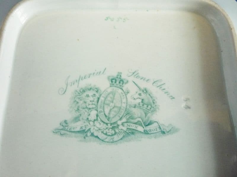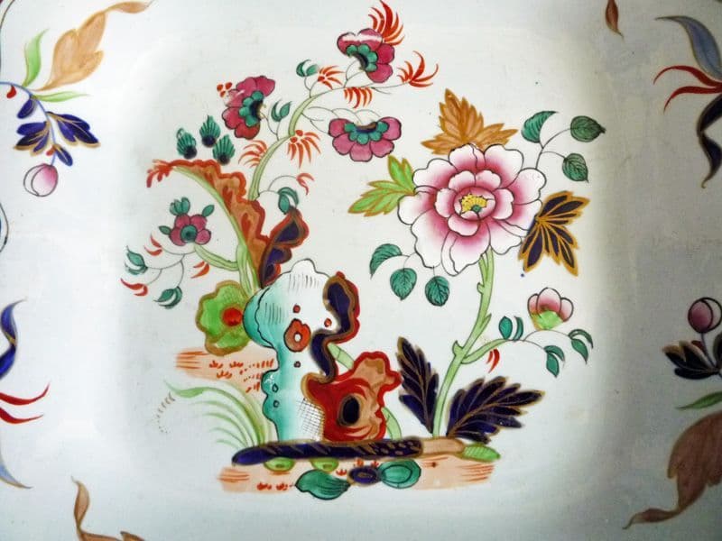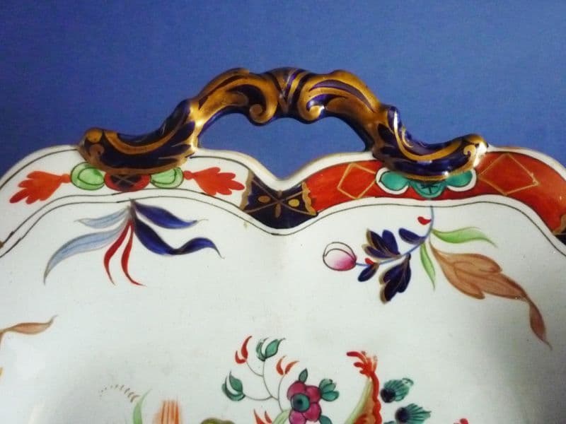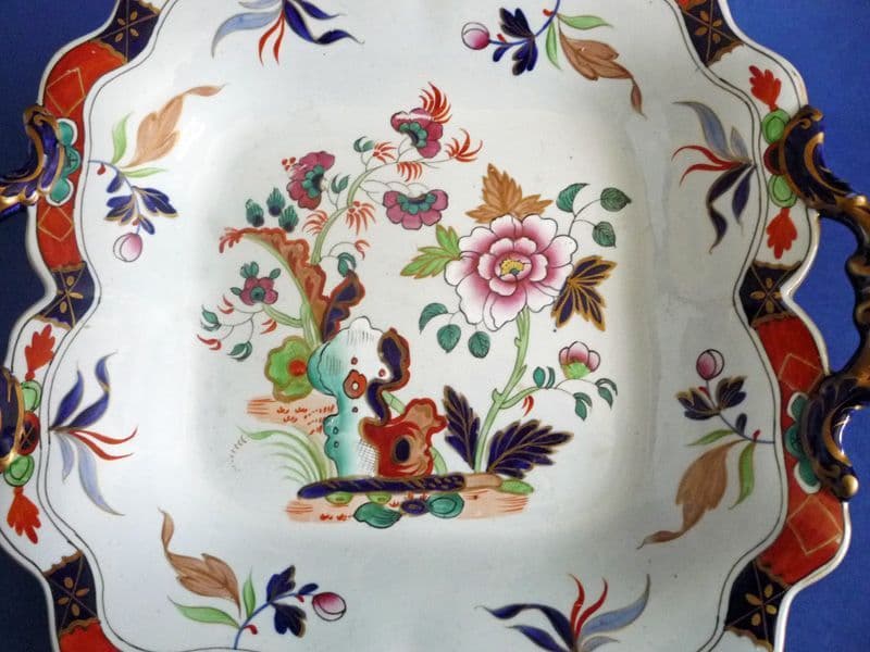 A fine quality Ridgway's serving dish with scrolled handles, printed in cobalt blue and richly painted in iron red, green and pink and highlighted with best gold. In excellent condition; no chips, cracks or restoration and showing little sign of wear. A very pretty dish and rare to find, especially in such good order. Printed Royal Arms with Imperial Stone China and initials JR. Painted pattern number 5055 and impressed date for 1854. Width 25.5cm (10in)