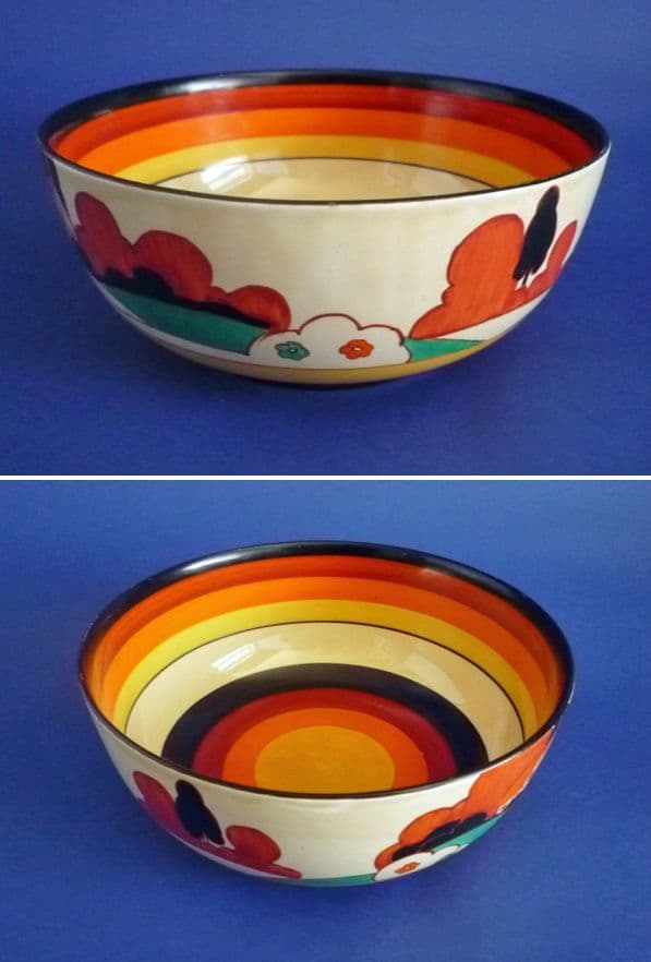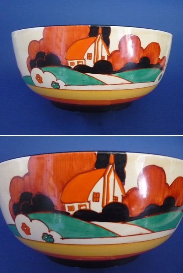 A beautifully decorated large 'Farmhouse' bowl, expertly painted with the design repeated twice as a continuous landscape. Superbly banded on the inside with yellow, orange, iron red and black. In excellent condition - no chips, cracks or restoration and showing little sign of wear. A rare item to find, especially in such good order. Signed 'FANTASQUE Bizarre by Clarice Cliff, Newport Pottery'. Diameter 21.5cm (8.45in)