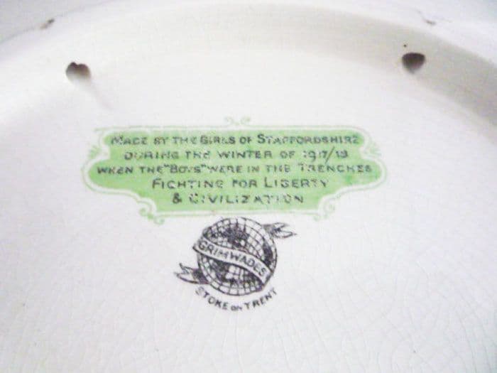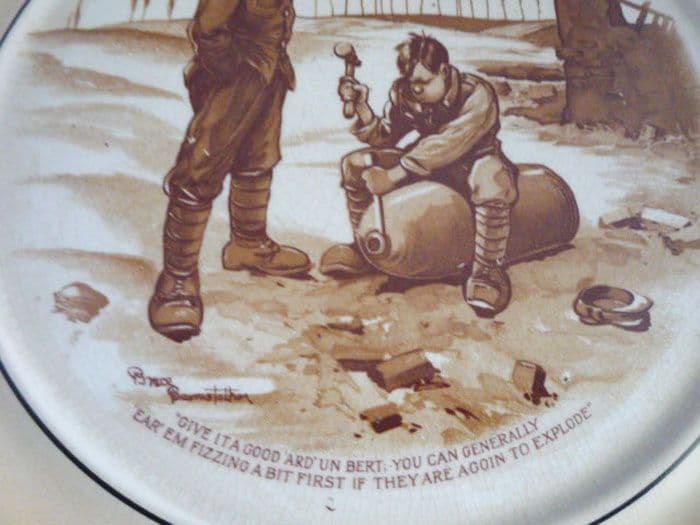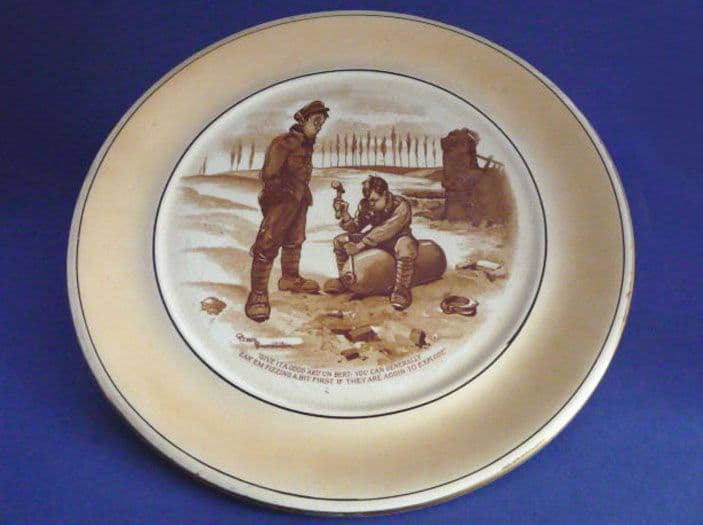 An excellent World War 1 Grimwades Bairnsfather Ware 'Old Bill' wall plaque with the caption "GIVE IT A GOOD 'ARD' UN BERT. YOU CAN GENERALLY 'EAR EM FIZZING A BIT FIRST IF THEY ARE AGOIN TO EXPLODE". Printed in sepia with Bruce Bairnsfather signature. In great condition; no chips, cracks or restoration. Mild age related crazing typical of these wares. Pierced foot rim for hanging. Grimwades globe and “Made by the Girls of Staffordshire during the Winter of 1917/18 when the Boys were in the trenches fighting for Liberty and Civilisation” backstamps. Diameter 25.5cm (10in)