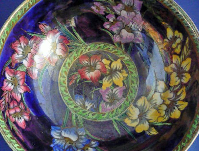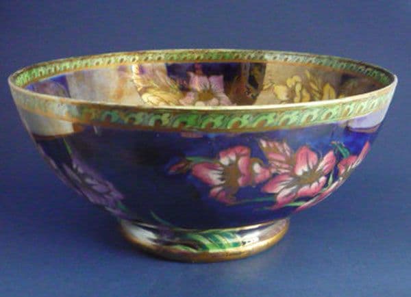 A large footed bowl from Maling in one of the rarer 1930's lustre designs - 'Gladioli' gold print on a dark blue background. A stunning piece with vibrant hand painted flower sprays in pink, yellow, blue and mauve on both the inside and outside of the bowl. The detail is then overprinted in gold to enhance the lustre effect. In great condition; no chips, cracks or restoration. Some age related rubbing of the gilt round the rim, but it's such a beautiful piece I feel this is acceptable and doesn't really detract. I've also tried to price it accordingly. Printed Maling mark and painted pattern number 6322. Diameter 21.75cm (8.6in)