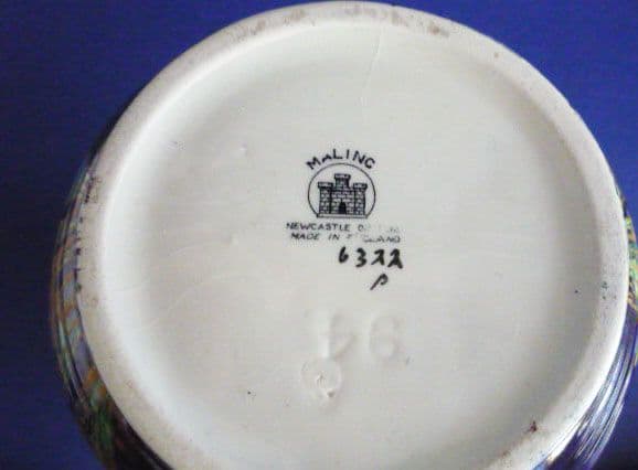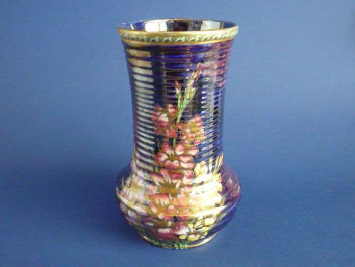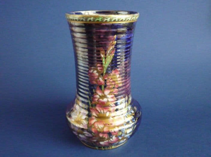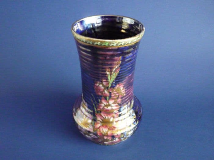 A large ribbed vase from Maling in one of the rarer 1930's lustre designs - 'Gladioli' gold print on a dark blue background. A stunning pattern with vibrant hand painted flower sprays in pink, yellow, blue and mauve on deep cobalt blue shaded to purple in places. The detail is then overprinted in gold to enhance the lustre effect. In great condition; no chips, cracks or restoration. Some age related rubbing of the gilt round the rim, but it's such a rare and beautiful piece I feel this is acceptable and doesn't really detract. Printed Maling mark and painted pattern number 6322. Height 21cm (8.25in)