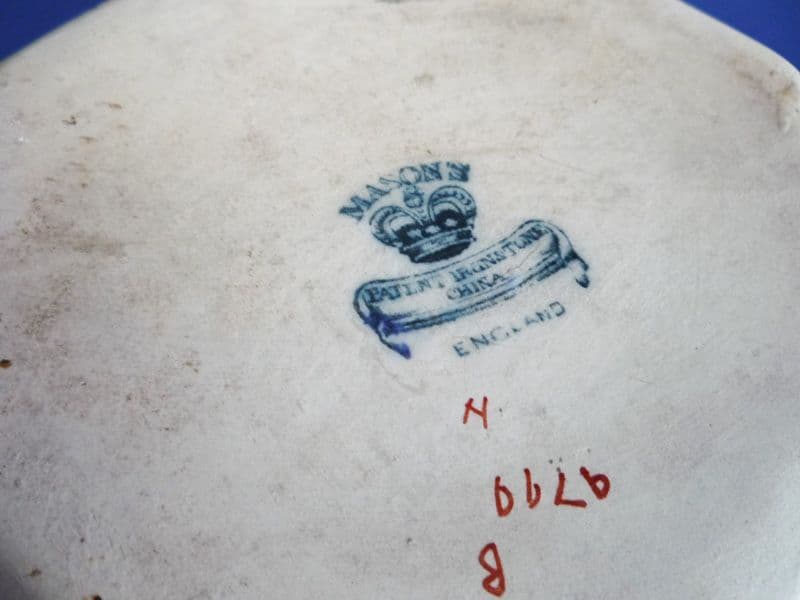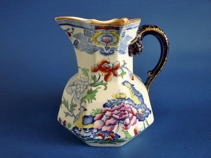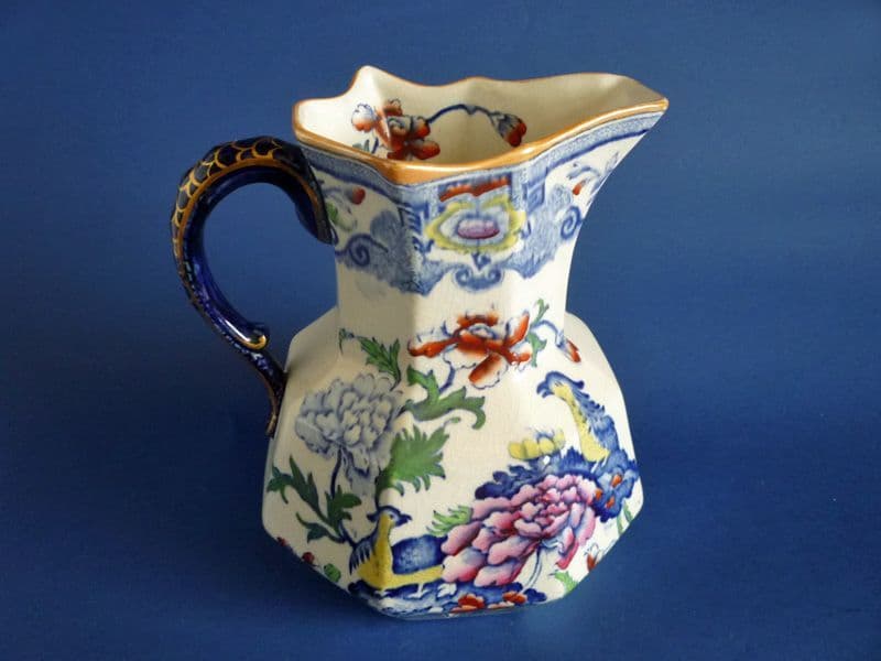 A large coloured 'blue pheasant' octagonal Ashworth's period Mason's Patent Ironstone jug with a pale lustre rim and hydra handle with rich gilt detail. Blue printed under the glaze with hand applied enamel colours and lovely floral detail to the inside rim. In excellent condition - no chips, cracks or restoration. Some age related crazing, but nothing to detract from this impressive piece. Mason's crown mark. Height 18.75cm (7.4in)