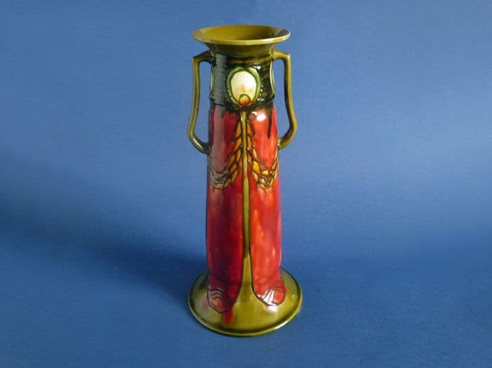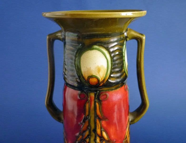 A large and impressive Secessionist vase with twin handles and tube lined in dark brown with swags and stylised white flowers on a red 'sang de boeuf' and olive green ground. Vibrant colours on a classic art nouveau shape that works beautifully with this John Wadsworth design. In excellent condition; no chips, cracks or restoration. Printed Mintons Ltd No.1 secessionist mark. Height 30cm (11.75in)