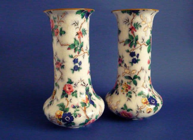 A lovely pair of Crown Ducal 'Ascot' Chintz vases with sprays of pink roses forming a delicate floral chintz on a white background. This early Richardson's pattern looks great on this rare pair. In excellent condition; no chips, cracks or restoration. Beautiful display items with early Crown Ducal backstamps. Height 23.5cm (9.25in)