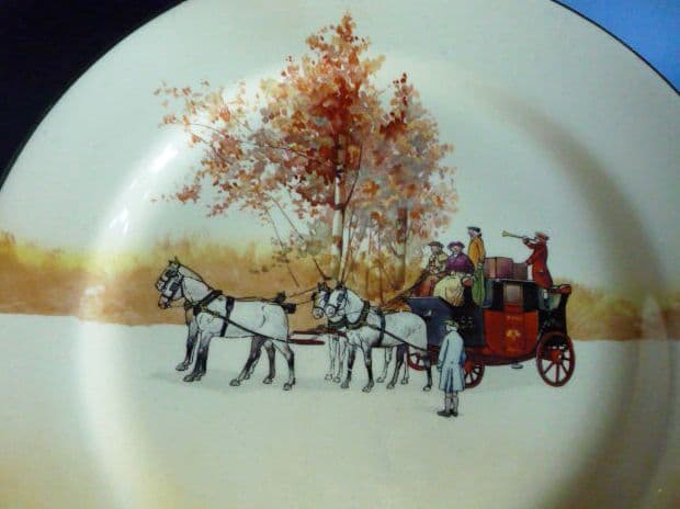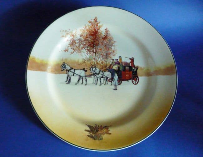 A large Royal Doulton rack plate from the coaching days series, depicting the coach horn sounding and the departure watched by a solitary man. Coach with red door and trim. Designed by the illustrator and cartoonist Victor Venner (fl.1904-24). Series number D4891. In excellent condition; no chips cracks or restoration. Lion, crown and circle Royal Doulton mark with impressed date for February 1936. Diameter 26cm (10.2in)