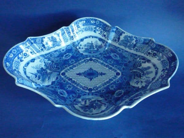A stunning large size footed comport in the Net pattern. Oval in shape with a lovely deep bowl, the medium blue print has a central design surrounded by four medallions, each with a different chinoiserie scene. The border and foot have a striking band of flowers and scrolls. The glaze has a fine rippled blue tinge associated with early pearlware. In excellent condition; a couple of minor faults being a slight glaze frit on one edge and some slight age staining underneath. Both mentioned for accuracy rather than anything serious. Overall, the condition is very good for an item of this age and size. This pattern is typically unmarked, but the shape is found in the Spode archives and in other patterns which are sometimes marked. Length 30.5cm (12in), height 11.5cm (4.5in)