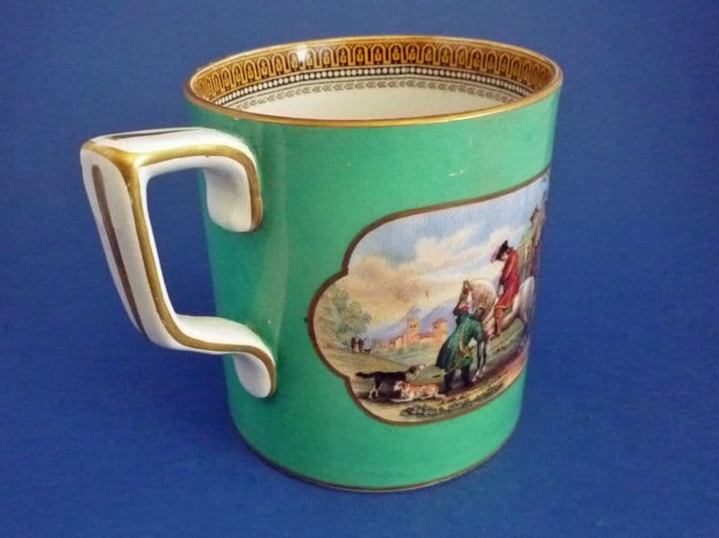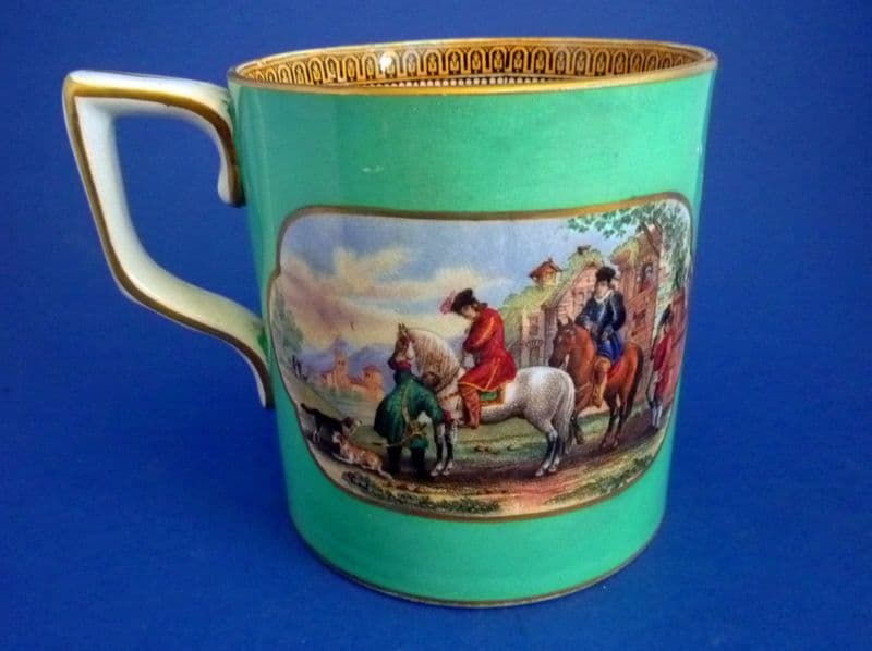 A large one pint Prattware mug with two rural scenes set in panels on a turquoise green ground. One scene 'The Torrent' with women and cattle by a river, the other 'The Travellers' Departure' with two riders and dogs. The inside has a repeat pattern border and the rim, base and handle are finished in best gold. In excellent condition - no chips, cracks or restoration and showing little sign of wear. The gilding is intact and there is only a tiny scratch to the green, barely noticed (above the cartouche, see image 1). Rare to find in such good order. Height 10.25cm (4in), diameter 9.5cm (3.75in)