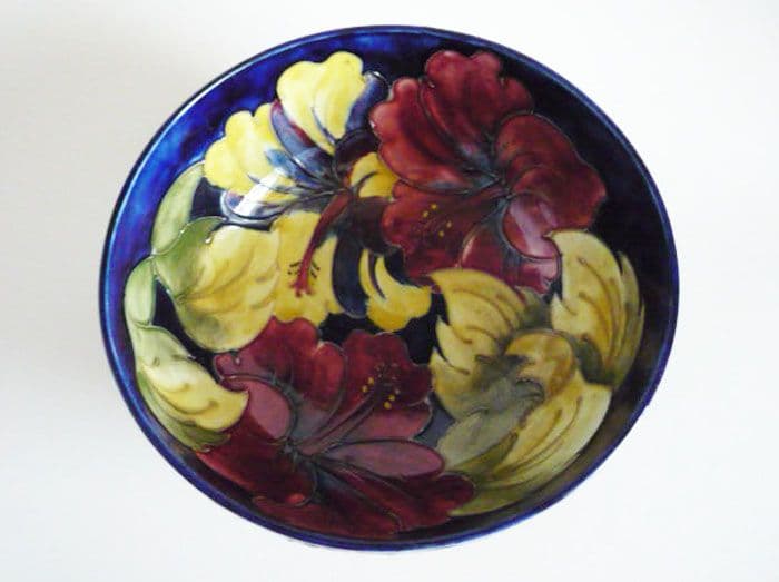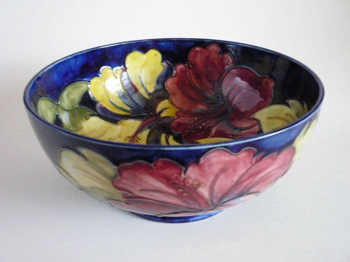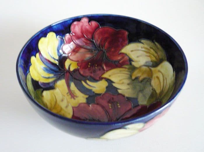 A stunning Hibiscus footed bowl, decorated inside and out with a mass of flowers in deep pink, yellow, green and mauve on a cobalt blue ground. In excellent condition; no chips, cracks or restoration. Some minor glaze crazing typical of these wares, but nothing to detract from the display value of this beautiful piece of vintage Moorcroft. Impressed marks with Walter Moorcroft's initials painted in blue and original paper label. Diameter 19.75cm (7.75in)