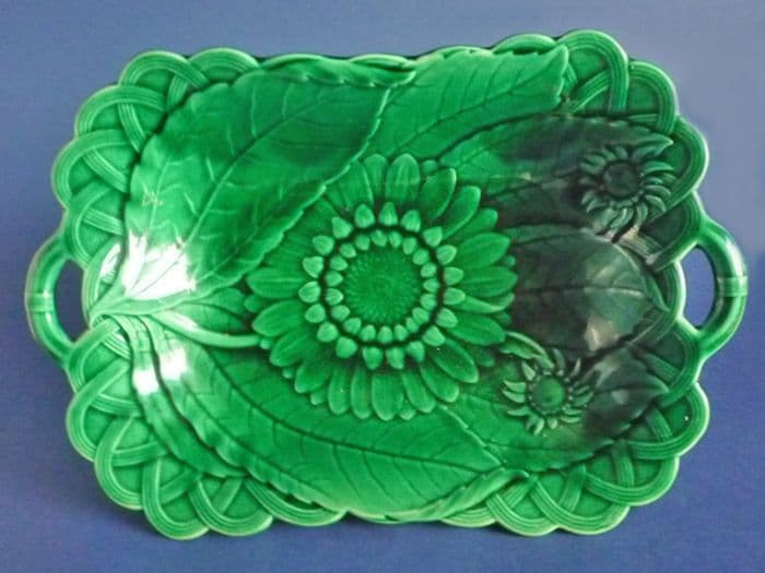 A large and impressive Wedgwood sunflower two handled comport. Great depth of colour and finely moulded. In excellent condition - no chips, cracks or restoration. Rare to find these large pieces in such good order. Impressed WEDGWOOD and date code for 1866. Width with handles 32.4cm (12.75in), height 10cm (4in)