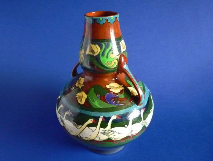 A large and impressive Intarsio two handled gourd shape vase decorated with a frieze of geese in a landscape, the neck and shoulders with panels of art nouveau buttercups. A colourful Frederick Rhead design that works beautifully on this fantastic shape. In excellent condition - no chips, cracks or restoration. Rare to find this size and shape, especially in such good order.