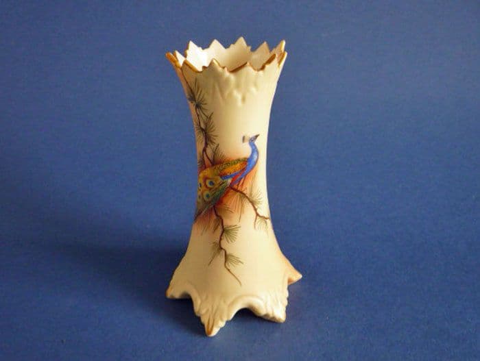 A lovely Locke and Co. blush ivory vase finely painted in colourful enamels with a peacock sitting on a tree branch. In excellent condition; no chips, cracks, restoration or wear. Rare to find in such good order. Printed Locke and Co. Ltd., Shrub Hill Works, Worcester, England globe mark. Height 13cm (5.1in)