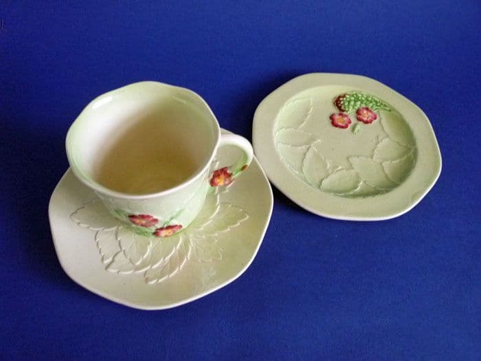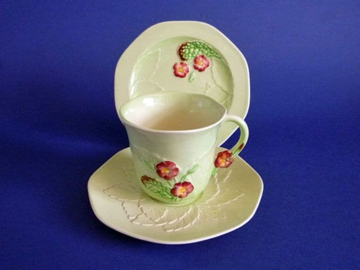 A fine Carlton Ware green primula trio, difficult to find these days in such good condition. No chips, cracks or restoration. Some mild crazing, but nothing to detract. Good colours - the flowers are a nice shade of pink and the green is bright but not too strong. Full Carlton Ware script mark and impressed shape numbers. Width of plate 13.4cm (5.3in)