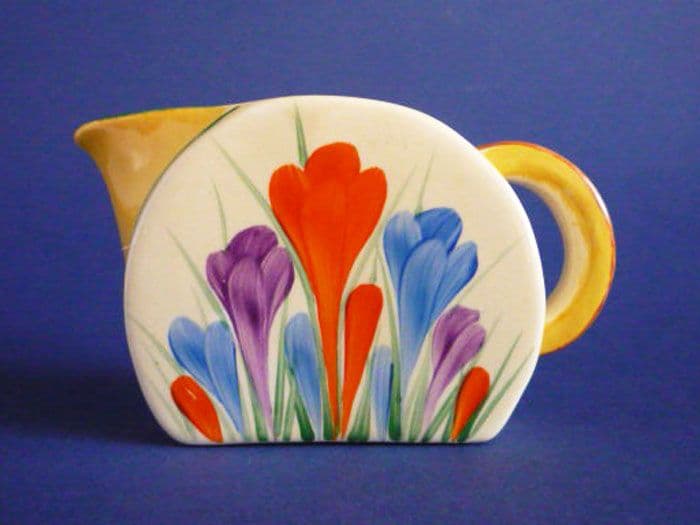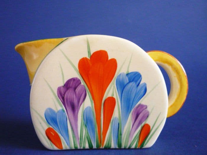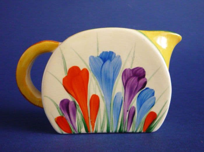 A superb little Bon Jour shape jug beautifully painted in Autumn Crocus. Lovely big flower sprays with bold brush strokes. A classic art deco shape in excellent condition; no chips, cracks, crazing, or restoration. Shows little sign of use or wear. Rare to find in such good order. Clarice Cliff, Wilkinson Ltd. signature and printed shape registration number 776243. Length from spout to handle 10.75cm (4.25in), height 6.25cm (2.5in)