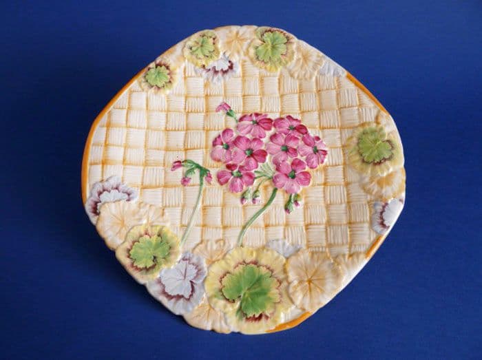 A fine art deco Royal Winton plate moulded with basket work and a spray of vibrant pink geranium flowers. The edge with naturalistically modelled geranium leaves in blues, greens and brown. The whole beautifully hand painted in bright colours with lots of detail. In great condition; no chips, cracks or restoration and minimum signs of wear. Some mild age related glaze crazing which is a common feature of this type of ware and doesn't detract. A striking display item and a rare shape to find in such good order. Printed 'Grimwades, Royal Winton, Gera' and date impressed for 1934. Width 22cm (8.65in)