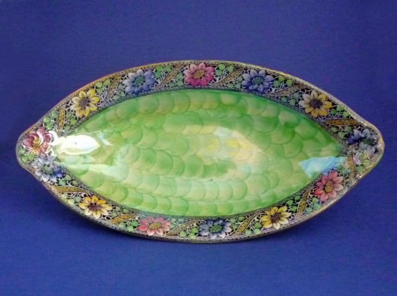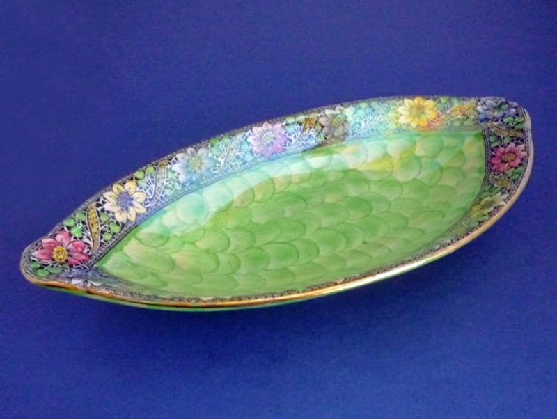 A lovely Maling 'Lace Border' art deco dish with a victoria green 'thumbprint' or waved background with a high lustre glaze. Colourful hand painted daisies in yellow, blue and pink around the rim. A vibrant design on a classic Maling shape. In excellent condition - no chips, cracks or restoration. Printed Maling mark and painted pattern number 6328. Length 26cm (10.25in)