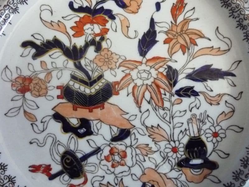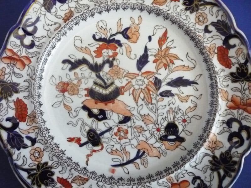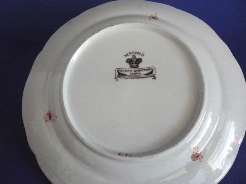 An early Mason's Patent Ironstone indented shape plate in a vibrant Japan pattern printed in sepia with underglaze blue and hand painted with iron red, pink and ochre. In excellent condition - no chips, cracks or restoration and showing little signs of wear. A nice touch is the disguising of the stilt marks on the reverse rim with hand painted little flowers in red. Printed 'Mason's Patent Ironstone China' crown mark in black with painted pattern number 2150 in red. Diameter 22.25cm (8.75in)