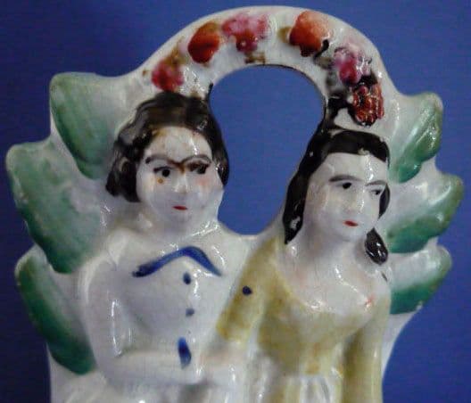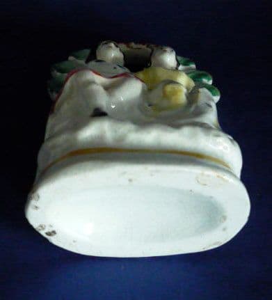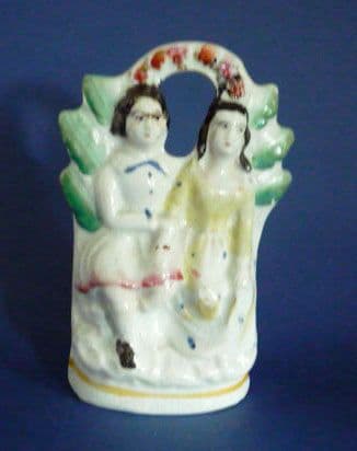 A charmingly naive portrait of a couple sitting in a bower, the man in a kilt, suggesting a Scottish theme. Nicely painted and in good condition, these miniature pieces of Staffordshire are becoming increasingly difficult to find. Height 12cm (4.7in)