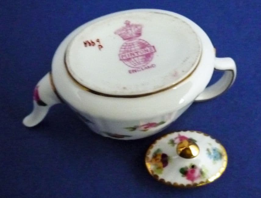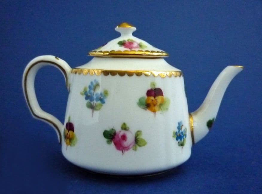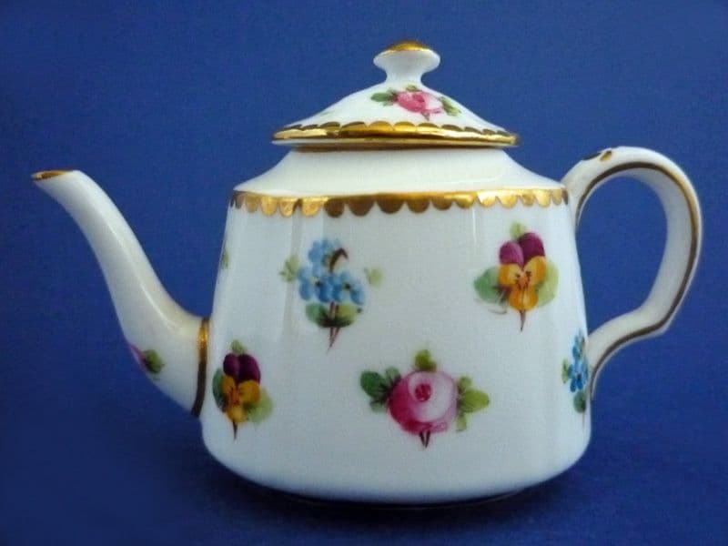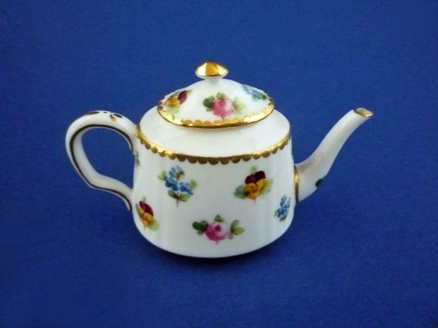 A superb miniature bone china teapot hand painted with tiny sprays of roses, pansies and forget-me-nots and finished with gold trim. Exact in every detail - it even pours. A fine example of Minton's high quality wares. In excellent condition - no chips, cracks or restoration and showing little sign of wear. Rare to find, especially in such good order. Printed Mintons England crown and globe mark (c1891-1905). Overall length with handle and spout 7.5cm (2.95in), height 4.75cm (1.9in)