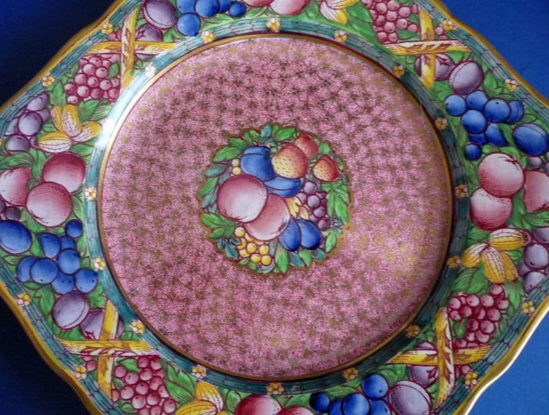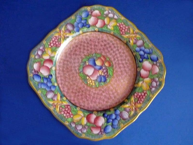 A stunning Minton plate from their 'Rotique' range of wares. Decorated with fruit on a pink ground, the outline of the design is finely printed in red and then all the detail is hand painted in bright enamels. Overprinted and trimmed with best gold, it was an expensive range to produce. In excellent condition - no chips, cracks or restoration and showing little sign of wear.