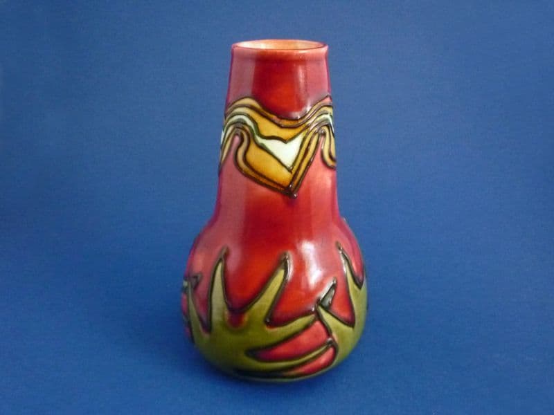 A lovely Secessionist vase designed by Leon Solon. A classic art nouveau shape tube lined in dark green with stylised spiky leaves around the base on a deep red ground. In excellent condition - no chips, cracks or restoration. Printed Mintons Ltd No.42 secessionist mark. Height 13cm (5.1in)