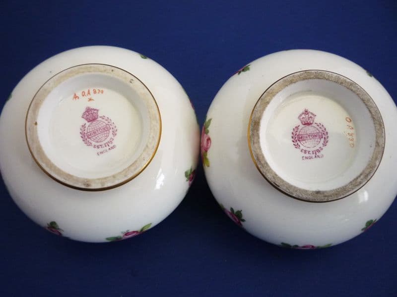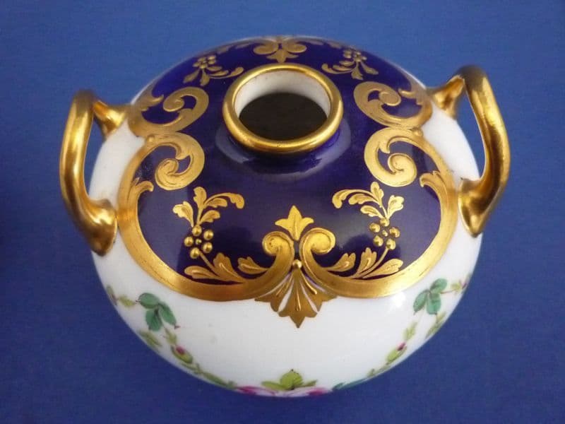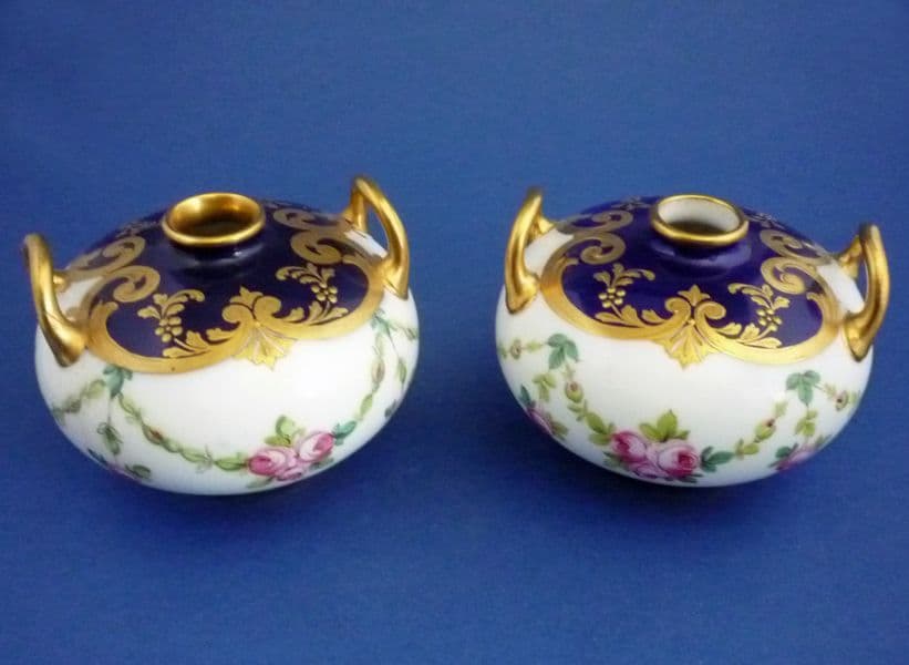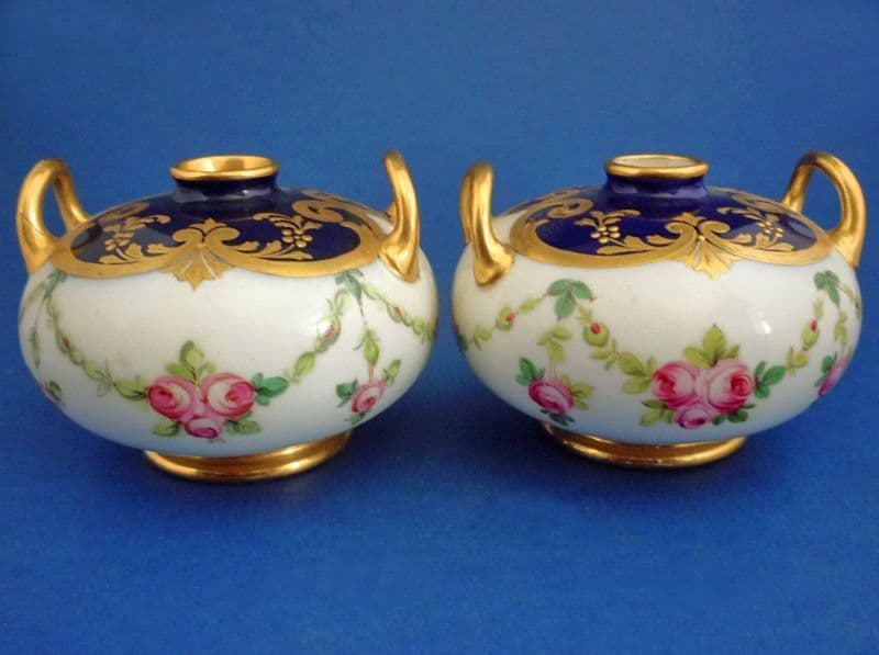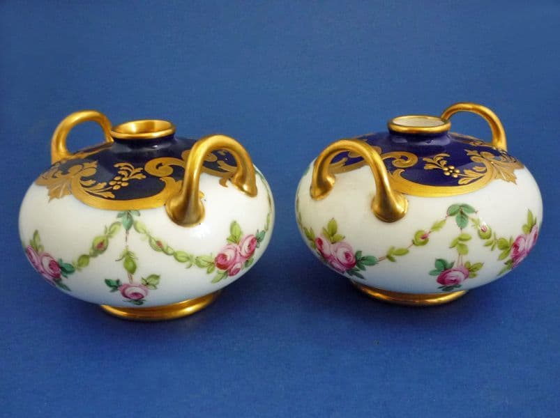 A beautiful little pair of bone china vases delicately hand painted with garlands of pink roses, the shoulders with tooled gilding on a deep cobalt blue ground. A pretty shape with two little gold handles. Fine examples from the period when Minton excelled at producing high quality wares for stores like Harrods and Tiffany. In excellent condition - no chips, cracks or restoration and no sign of wear to the gilding. Rare to find a pair, especially in such good order. Printed Mintons England crown, globe and wreath marks with painted decorator's initials. Height 6.25cm (2.5in), width 8cm (3.1in)